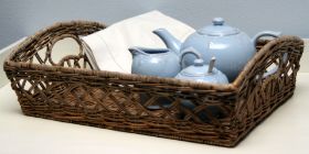Rattan dienblad. 43 cm lang en 33 cm breed en 14 cm hoog. nr: 877. € 23,90.